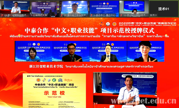 会议同时发布了多项中泰合作“中文+职业技能”项目成果。我校荣获中泰合作“中文+职业技能”项目示范校,校长陈德泉代表学校接受授牌,并与泰国宗通职业学院签署了“中文+职业技能”项目校际合作协议,设立宗通职业学院项目合作推广基地,进一步优化了学校对泰教育交流合作布局。