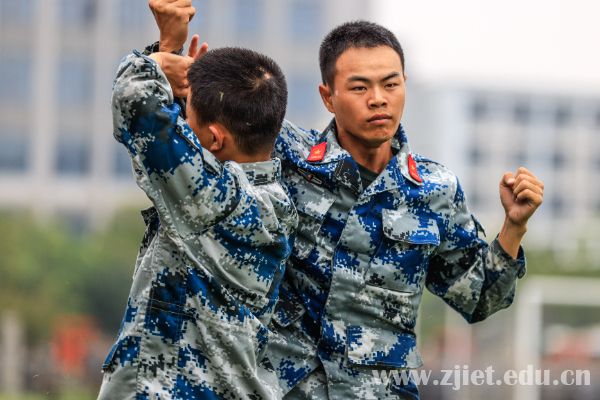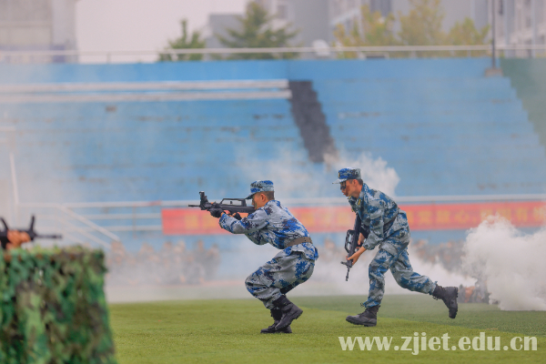 军事技能综合展示在激昂的音乐中震撼上演。团体操方阵依次摆出“喜迎二十大”“奋进征程”等字样,用青春告白祖国擒敌拳方阵拳拳生风,势如猛虎;棍术方阵身棍合一,行云流水;旗语方阵挥舞青春,激情梦想;女生捕俘刀方阵铿锵有力,展现出巾帼不让须眉的强劲战斗力;战术方阵模拟实战演练,精彩演绎红蓝对抗。全体参演新生以意气风发的英姿,展现出经贸新青年团结、奋进、进取的风貌!