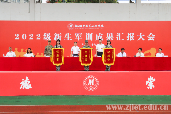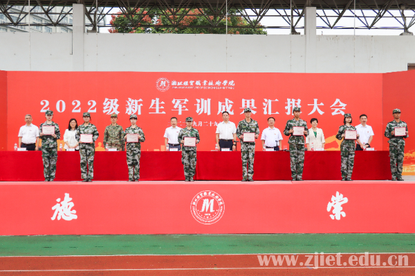 94973部队管理科科长梁孝挺宣读《关于表彰2022级学生军训先进集体和先进个人的决定》后与会领导为受表彰的先进集体和优秀个人代表颁奖。