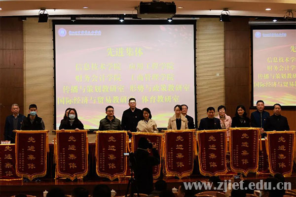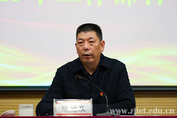 校长陈德泉代表学校向一年来为学校事业发展兢兢业业、辛勤努力、默默付出的广大教职员工表示感谢和敬意,并作题为《乘势而上,聚力而行,在踔厉奋发中续写高质量发展新篇章》报告,从全面实施红色根脉强基工程、全面贯彻上级安全稳定决策部署、全面落实立德树人根本任务、全面推进提质培优行动计划、全面搭建招生就业服务载体、全面构筑开放办学互促共进发展格局、全面推进干部人事队伍建设、全面助力共同富裕示范区建设、全面深化学校治理体系现代化等9个方面总结回顾了学校2022年的工作,客观分析了学校当前工作中存在的短板弱项和后续发展中面临的突出问题,并以 “一条主线”“两大重点”“三个坚持”“四则运算”“五大新跃升”的总体思路对学校2023年度重点工作进行了系统部署。他希望,全体教职工要进一步提高政治站位,增强看齐意识,不断总结经验、创新工作方法、提升服务质效,把学校发展与职业教育改革大趋势结合起来,把个人发展与学校发展大局结合起来,以一往无前的姿态、中流击水的劲头,共同谱写现代化职业教育新发展的经贸答卷!