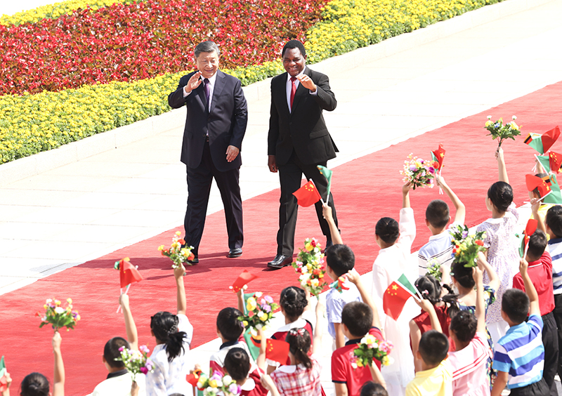 9月15日上午,国家主席习近平在北京人民大会堂同来华进行国事访问的赞比亚总统希奇莱马举行会谈。这是会谈前,习近平在人民大会堂东门外广场为希奇莱马举行欢迎仪式。新华社记者 刘卫兵 摄