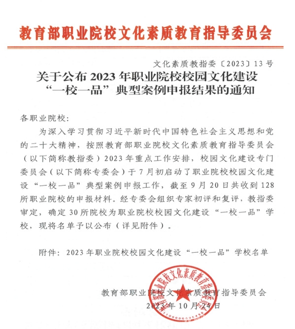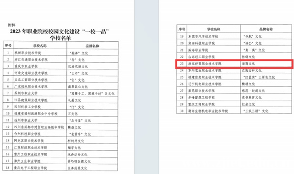 日前,教育部职业院校文化素质教育指导委员会公布了2023年职业院校校园文化建设“一校一品”典型案例申报结果,我校“浙商文化”品牌成功入选2023年职业院校校园文化建设“一校一品”学校。